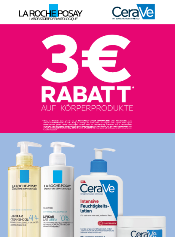 Dann lernen Sie jetzt LA ROCHE-POSAY und CERAVE kennen und sparen Sie beim Kauf einer KÖRPERPFLEGE UND -REINIGUNG 3€. Aktion gültig bis 31.12.2025, ab einem Einkaufswert von 10€.